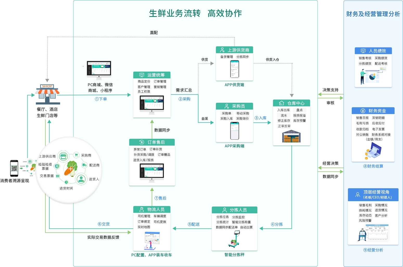农产品供应链数字化平台(即安菲生鲜食材配送管理平台),结合农产品供应链上下游主体经营场景和痛点,打造了生鲜配送系统、团餐配送系统、餐饮配送系统、中央厨房管理系统、净菜加工系统、社区团购系统等SaaS系统。通过系统,助力农产品高效流通,企业精细化管理,人工效率提升,最终实现企业运营降本增效。